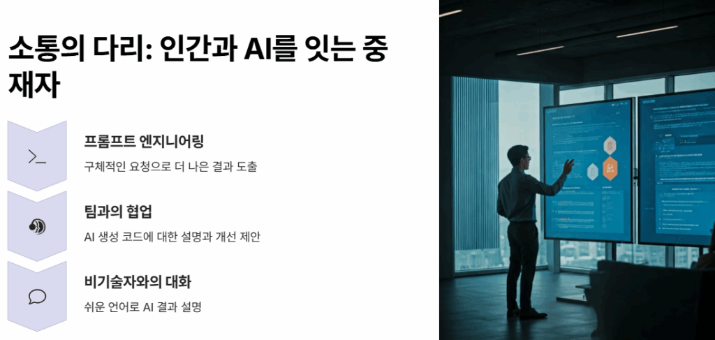 AI와 협업하려면 소통 능력이 필수예요. 개발자는 AI에게 명확한 지시를 내리고, 그 결과를 팀원이나 이해관계자에게 설명하는 중재자 역할을 해야 하죠. 이건 단순한 기술적 스킬을 넘어 커뮤니케이션 역량이기도 해요.