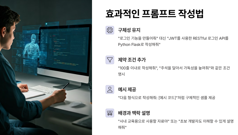 AI에게 요청할 때는 최대한 구체적으로 설명하는 것이 좋아요. 예를 들어, “로그인 기능을 만들어줘”라고만 하면 다양한 방식의 답변이 나올 수 있어요. 하지만 “JWT를 사용한 RESTful 로그인 API를 Python Flask로 작성해줘”라고 요청하면, AI가 어떤 언어와 기술을 사용해야 하는지 명확하게 이해해서 훨씬 정확한 결과를 제공할 수 있습니다. - 제약 조건을 추가하세요