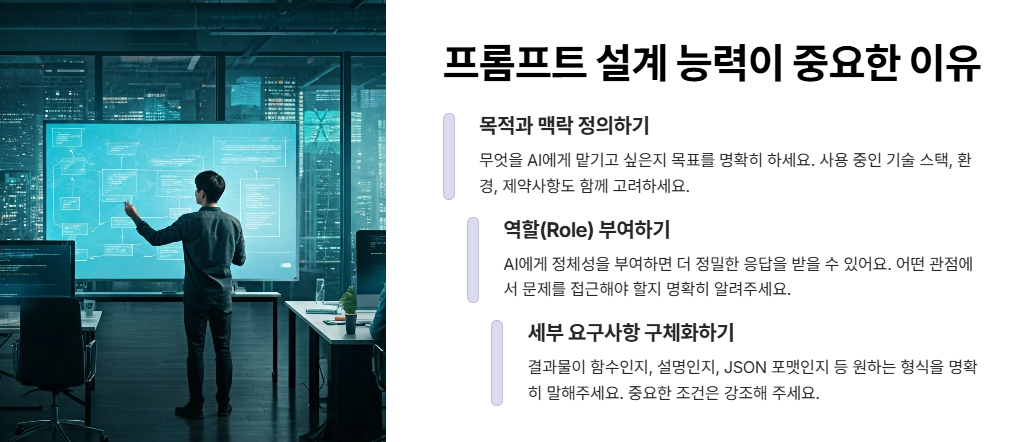프롬프트 설계 능력은 AI를 효과적으로 활용하는 개발자가 되기 위한 핵심 역량입니다. 단순히 명령을 입력하는 수준을 넘어, AI가 맥락을 이해하고 원하는 결과를 정확히 도출할 수 있도록 유도하는 기술이에요. 이 능력을 갖추면 AI와의 협업 효율이 크게 높아집니다.