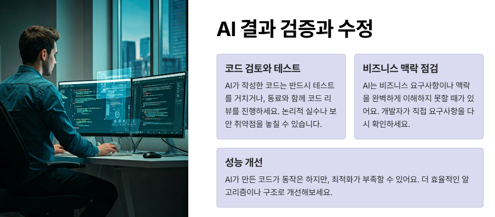AI가 작성한 코드는 반드시 테스트를 거치거나, 동료와 함께 코드 리뷰를 진행하는 것이 좋아요. AI가 논리적인 실수나 보안 취약점을 놓칠 수 있기 때문이에요. 예를 들어, 입력값 검증이 누락됐거나, 예외 처리가 부족한 경우가 있을 수 있습니다. 실제로 개발 현장에서는 AI가 만든 코드를 팀원들과 함께 리뷰하면서 품질을 높이는 사례가 많아요. - 비즈니스 맥락 점검